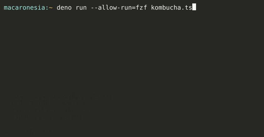 Fortunately, Deno has some nice APIs for spawning external commands, so we can just use the real fzf binary instead. Here’s some code I’ve used in a few places in order to spawn FZF in order to do some interactive selection: