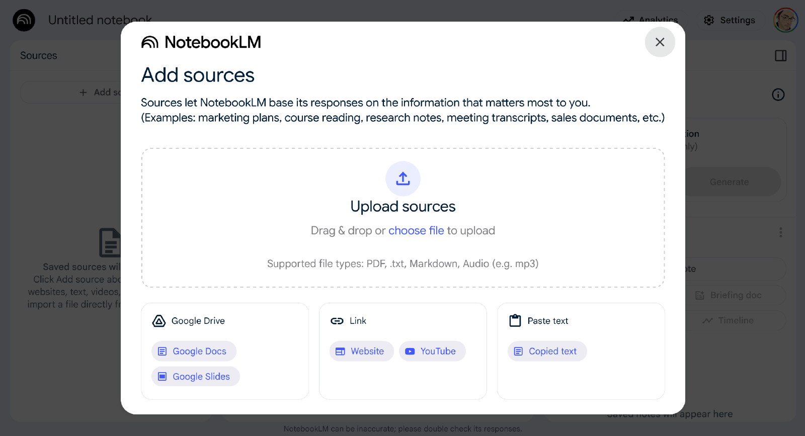 To get started, head over to NotebookLM and sign in with your Google account. Once you’re in, click on the “Create a notebook” button and you’ll be prompted to begin adding some sources.
