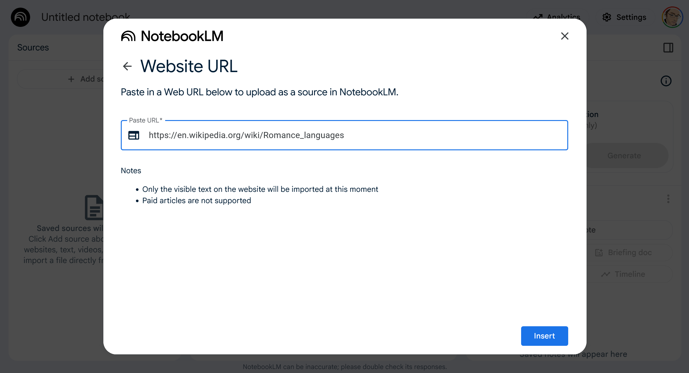I recommend starting with the Wikipedia page for the topic you’ve chosen. NotebookLM has very good support for Wikipedia, and it serves as a good general overview of the topic. Depending on the topic, I often add a few more Wikipedia pages to provide more depth and related content.