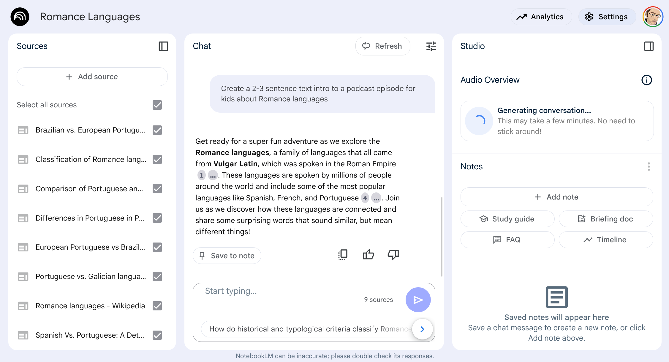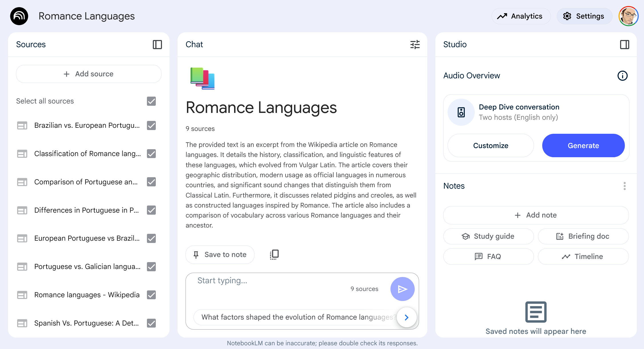 Once you’ve added a bunch of sources, you’ll see them all listed and you can use the chat interface to ask questions about the topic