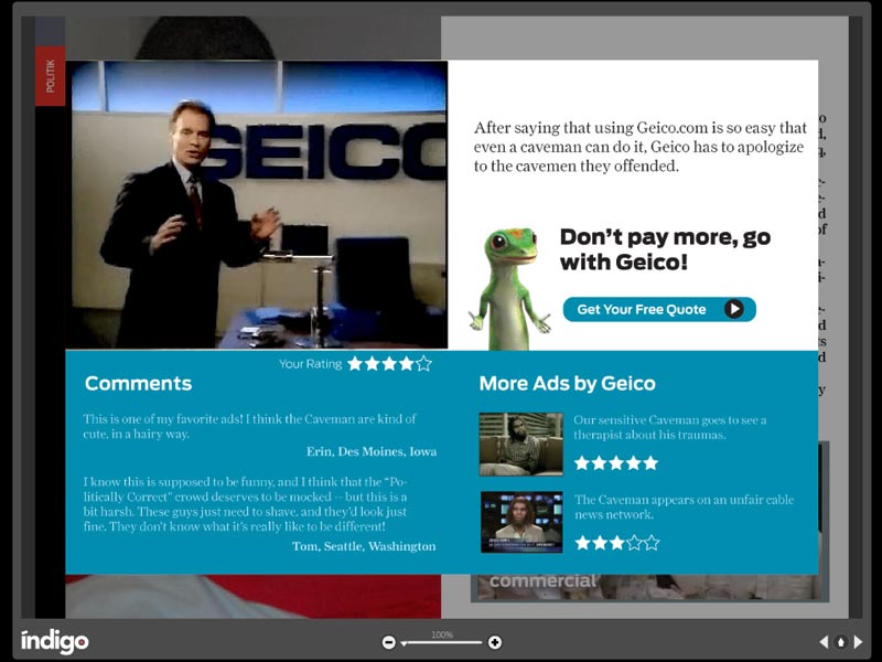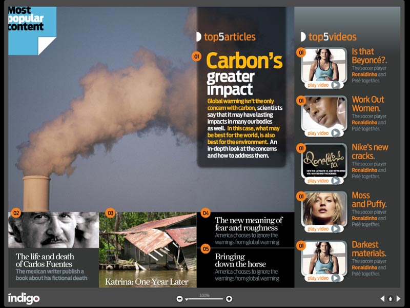 During the session, I showed a demo that myself and Roger Black (amongst others) have been working on in the past couple of weeks. It’s a rendition of the English-language version of Reporte Indigo, a Mexican online weekly magazine currently done in Flash. Our goal was to show some of the directions we see online reading experiences moving toward: richer, branded layouts that look good across a variety of screen dimensions, integrated media, richer advertisements, and continued increases in community-driven features. My big fat mouth has more to say about this area, but that will have to wait until another post.